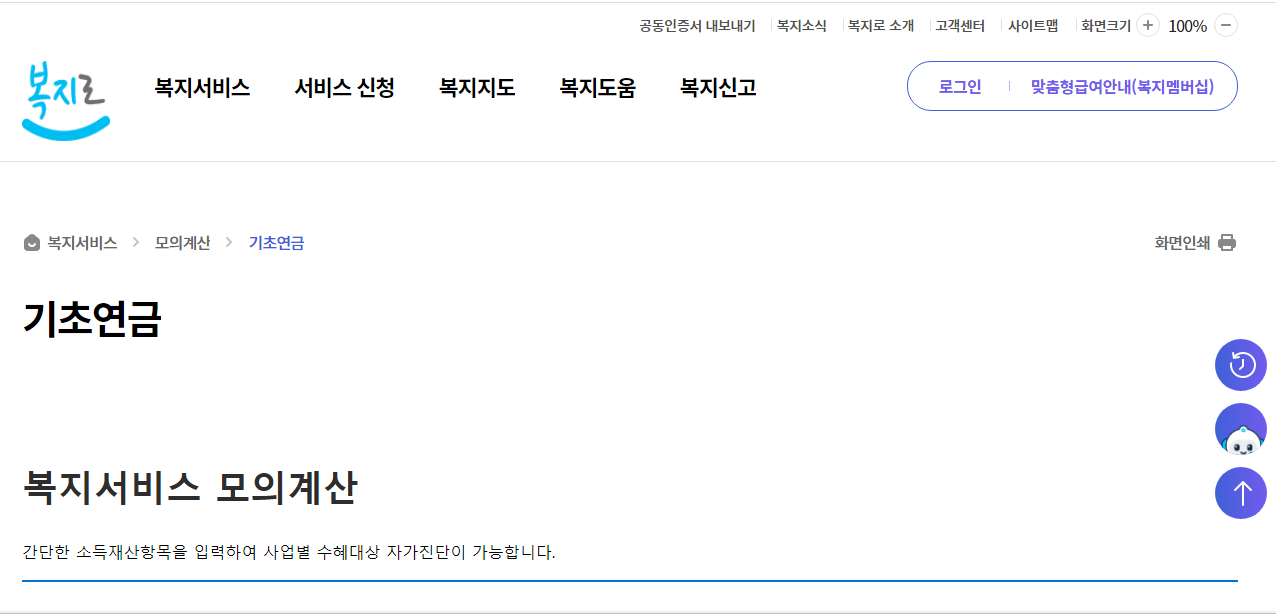 우선 복지로 사이트로 이동합니다. (링크)복지로 기초연금 모의계산링크 url로 이동하면 바로 기초연금 모의계산 페이지가 나옵니다.