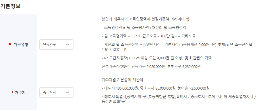 | 선정기준액 | 단독가구 2,020,000원, 부부가구 3,232,000원 |