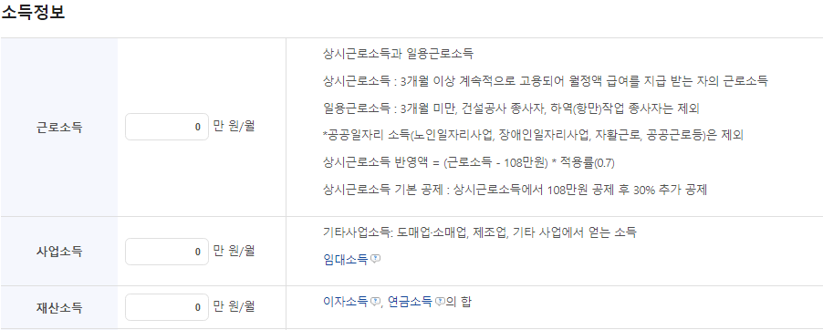 | 기타소득 | 사업소득, 재산소득, 공적이전소득(국민연금 등), 무료임차소득 |