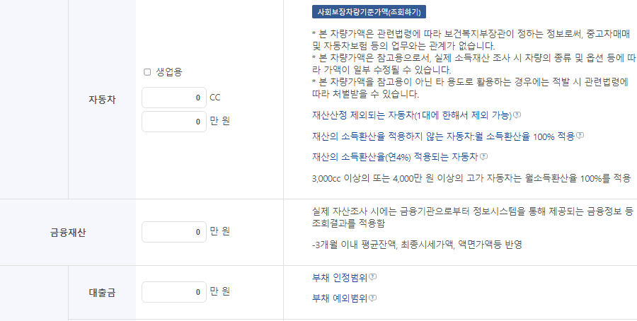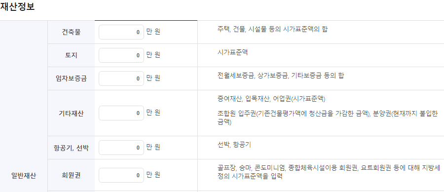 | 기본재산액 | 대도시(1억3천5백만 원), 중소도시(8천5백만 원), 농어촌(7천2백5십만 원), 금융재산(가구당 2천만 원) |