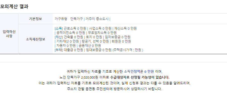 (※이것은 아무것도 입력하지 않은 것의 모의 결과입니다.)이런식으로 결과가 나타납니다. 모의 계산을 해보시면 자신이 기초연금 대상자인지 확인할 수 있기 때문에 ‘수급대상자로 선정될 가능성이 있습니다.’라는 결과가 나온다면 주소지 관할 읍면동 주민센터에 방문하셔서 상담을 진행하시면 됩니다.